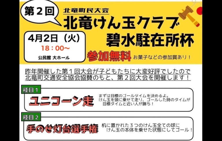 2024年3月25日(月) 延期になっていました「第2回北竜けん玉クラブ碧水駐在所杯」が、4月2日(火)18:00〜、北竜町公民館にて、北竜町民限定で開催されることとなりました(協賛:北竜町交通安全協 […]