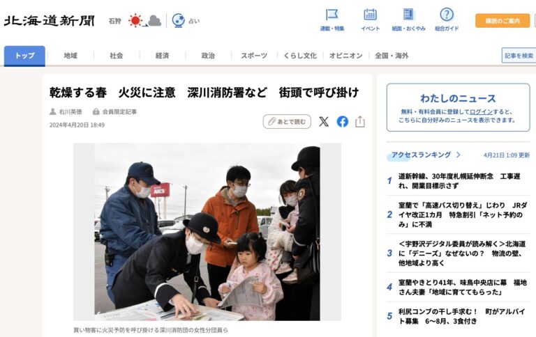 2024年4月22日(月) 北海道新聞社(札幌市)が運営するインターネットサイト【北海道新聞デジタル】に、「乾燥する春 火災に注意 深川消防署など 街頭で呼び掛け(4月20日付け)が掲載されていますの […]