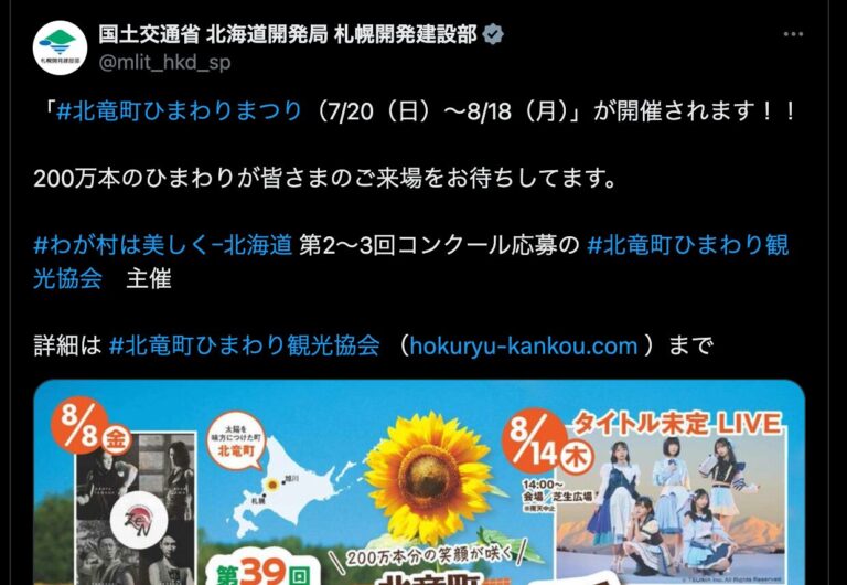 2025年7月17日(木) 国土交通省 北海道開発局 札幌開発建設部(札幌市)が運営する【SNS X】に、「#北竜町ひまわりまつり(7/20(日)~8/18(月)」の記事(7月14日付け)が掲載されて […]