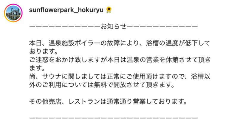 2023年1月11日 1月11日(水)18:00 復旧いたしましたのでご連絡いたします! この投稿をInstagramで見る サンフラワーパーク北竜温泉【公式】(@sunflowerpark_hoku […]