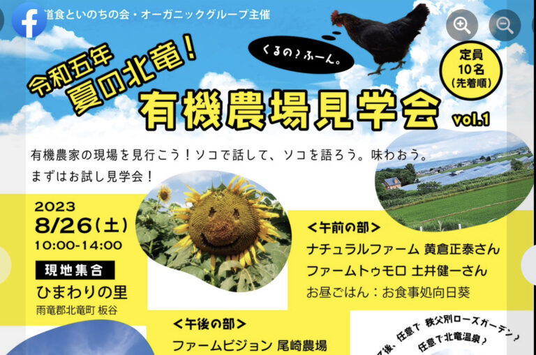 2023年9月4日(月) 北海道食といのちの会(札幌市・久田徳二 代表)が主催する「令和5年夏の北竜!有機農業見学会」が、北竜町の農場「ナチュラルファーム(黄倉正秦 代表)」「ファームトゥモロ(土居健 […]