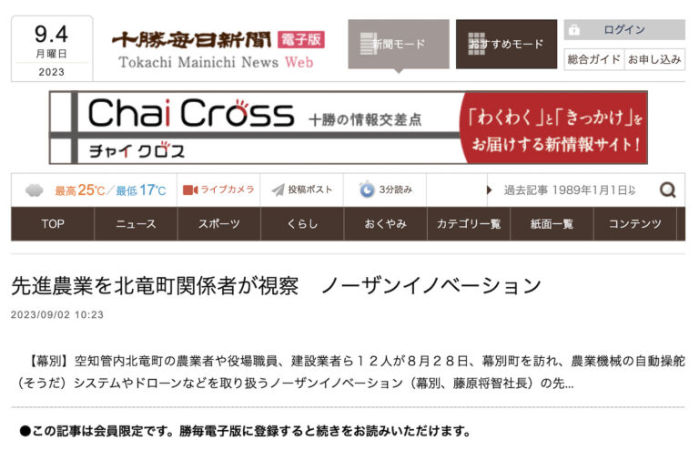 2023年9月4日(月) 十勝毎日新聞社(帯広市)が運営するインターネットサイト「十勝毎日新聞・電子版」に、「先進農業を北竜町関係者が視察 ノーザンイノベーション」の記事(9月2日付け)が掲載されてい […]