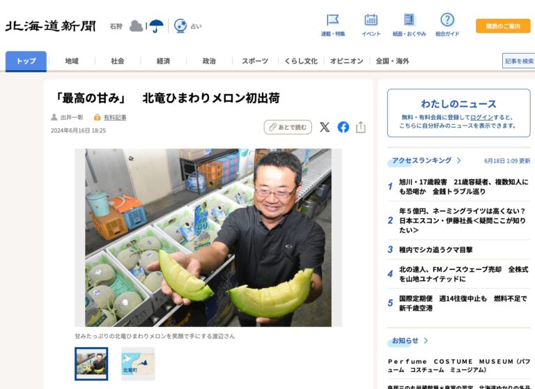 2024年6月19日(水) 北空知新聞(深川市)が運営するインターネットサイトに、「北竜町産『ひまわりメロン』出荷スタート なめらかな果肉は甘さも抜群」の記事(6月19日付け)が掲載されましたので、ご […]