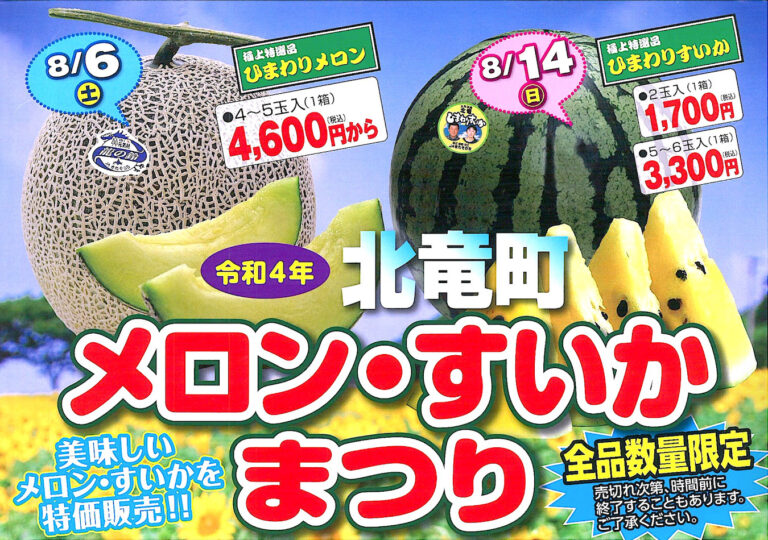 गुरुवार, 4 अगस्त, 2021 इस वर्ष, 2022 में, सूरजमुखी तरबूज प्रत्यक्ष बिक्री कार्यक्रम शनिवार, 6 अगस्त को 08:30 से 11:00 बजे तक आयोजित किया जाएगा, और सूरजमुखी तरबूज प्रत्यक्ष बिक्री कार्यक्रम रविवार, 14 अगस्त को 08:30 से 11:00 बजे तक जेए कितासोराची होकुर्यु शाखा (होकुर्यु टाउन) में आयोजित किया जाएगा [...]
