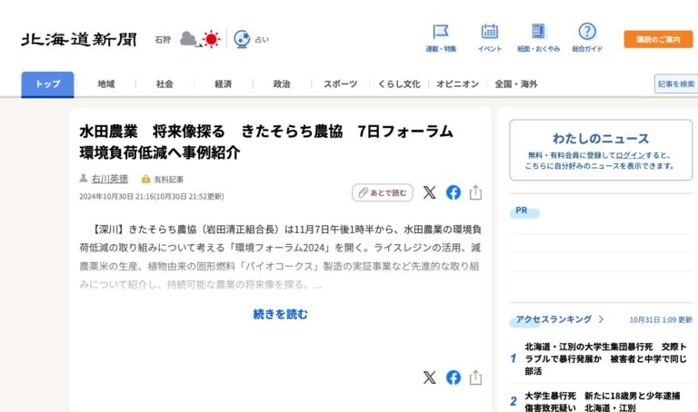 2024年10月31日(木) 北海道新聞社(札幌市)が運営するインターネットサイト【北海道新聞デジタル】に、「水田農業 将来像探る きたそらち農協 7日フォーラム 環境負荷低減へ事例紹介」の記事(10 […]