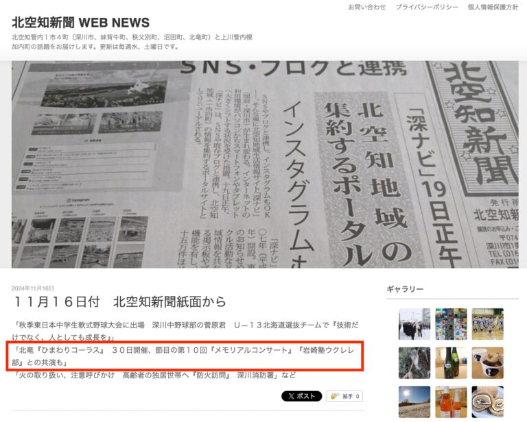 2024年11月18日(月) 北空知新聞社(深川市)が運営するインターネットサイト【北空知新聞】に、「北竜『ひまわりコーラス』 30日開催、節目の第10回『メモリアルコンサート』 『岩崎塾ウクレレ部』 […]