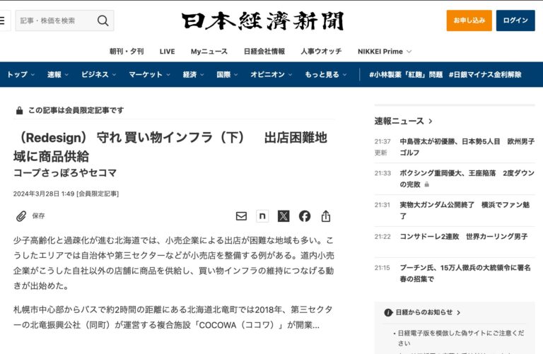 2024年4月1日(月) 株式会社 日本経済新聞社(東京都)が運営するインターネットサイト【日本経済新聞社】に、「(Redesign) 守れ 買い物インフラ(下) 出店困難地域に商品供給」の記事(3月 […]