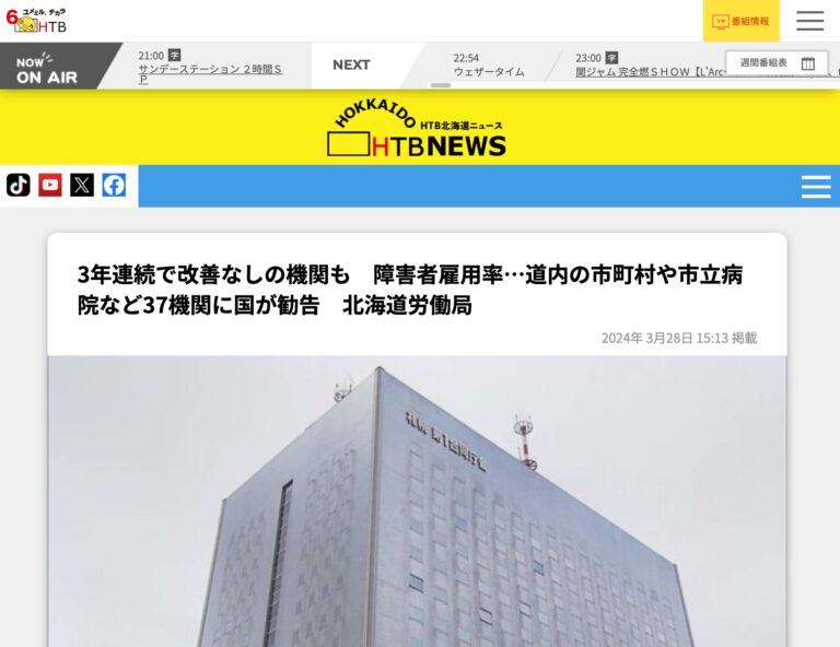 2024年4月1日(月) 北海道テレビ放送株式会社(HTB・札幌市)が運営するインターネットサイト【北海道テレビ:HTB online】に、「3年連続で改善なしの機関も 障害者雇用率…道内の市町村や市 […]