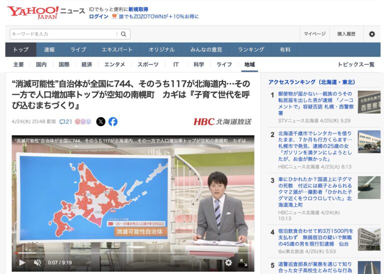 2024年4月25日(木) インターネットサイト【Yahoo!JAPAN ニュース】に【HBC 北海道放送】の記事「“消滅可能性”自治体が全国に744、そのうち117が北海道内…その一方で人口増加率ト […]