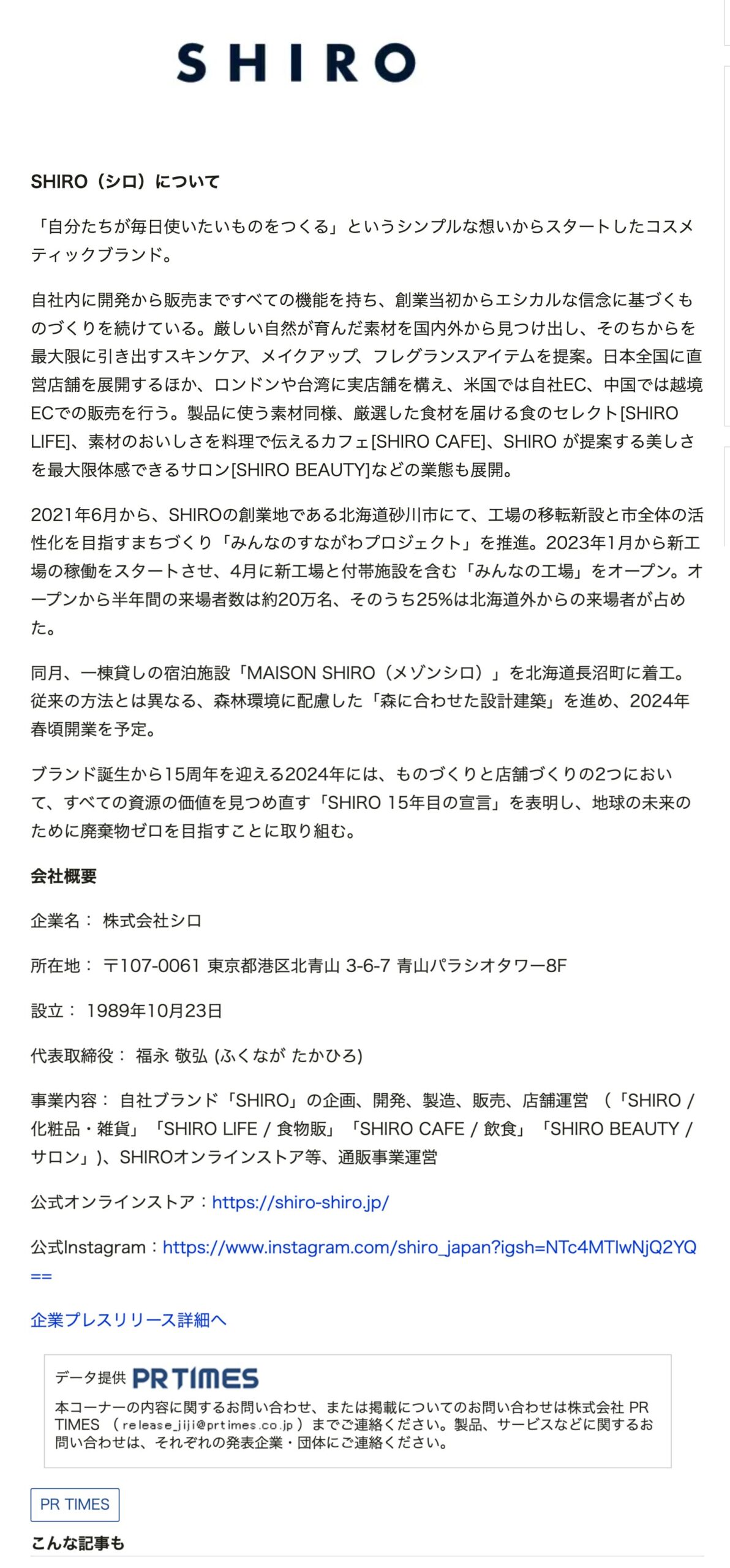 บทความ (ลงวันที่ 11 มีนาคม) ได้ถูกโพสต์บนเว็บไซต์ Jiji.com ซึ่งเป็นเว็บไซต์ที่ดำเนินการโดย Jiji Press Inc. (โตเกียว) หัวข้อ "การใช้เศษไม้สนชนิดหนึ่งจากเมืองโฮคุริว ฮอกไกโด" ซึ่งมีเนื้อหาว่า "SHIRO ลงนาม 'ข้อตกลงกับกระทรวงเกษตร ป่าไม้ และประมง เพื่อส่งเสริมการขยายการใช้ไม้ในอาคารที่บริษัท SHIRO จำกัด'" ซึ่งเราอยากจะแนะนำให้คุณรู้จัก
